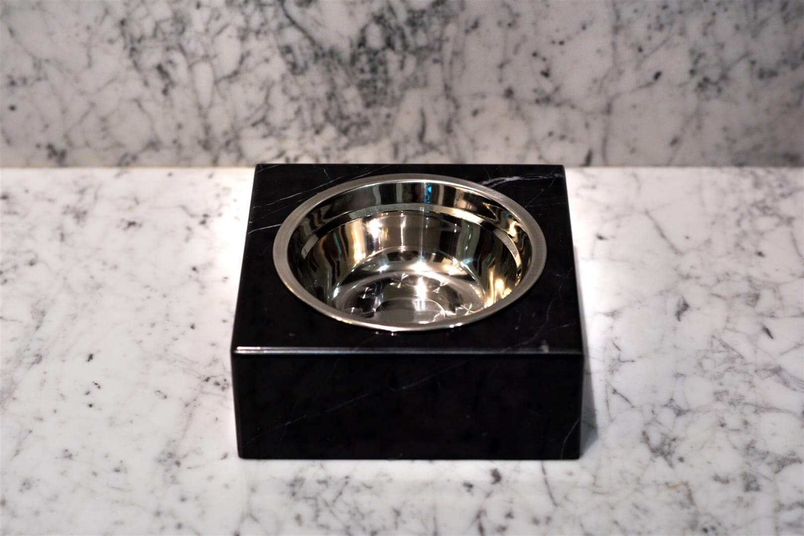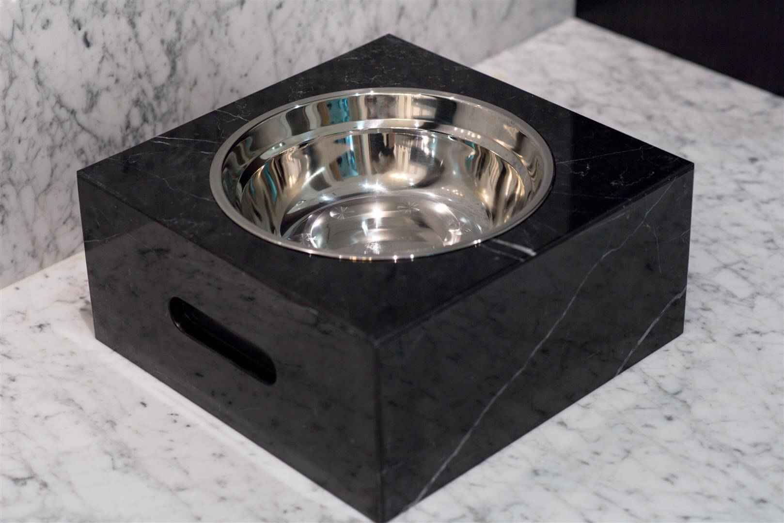 Fabricated from solid slab onyx + marble these beauties will get your pet in style while they dine on their Epicurean delights. Stainless steel bowl is machine washable to allow for effortless clean up.