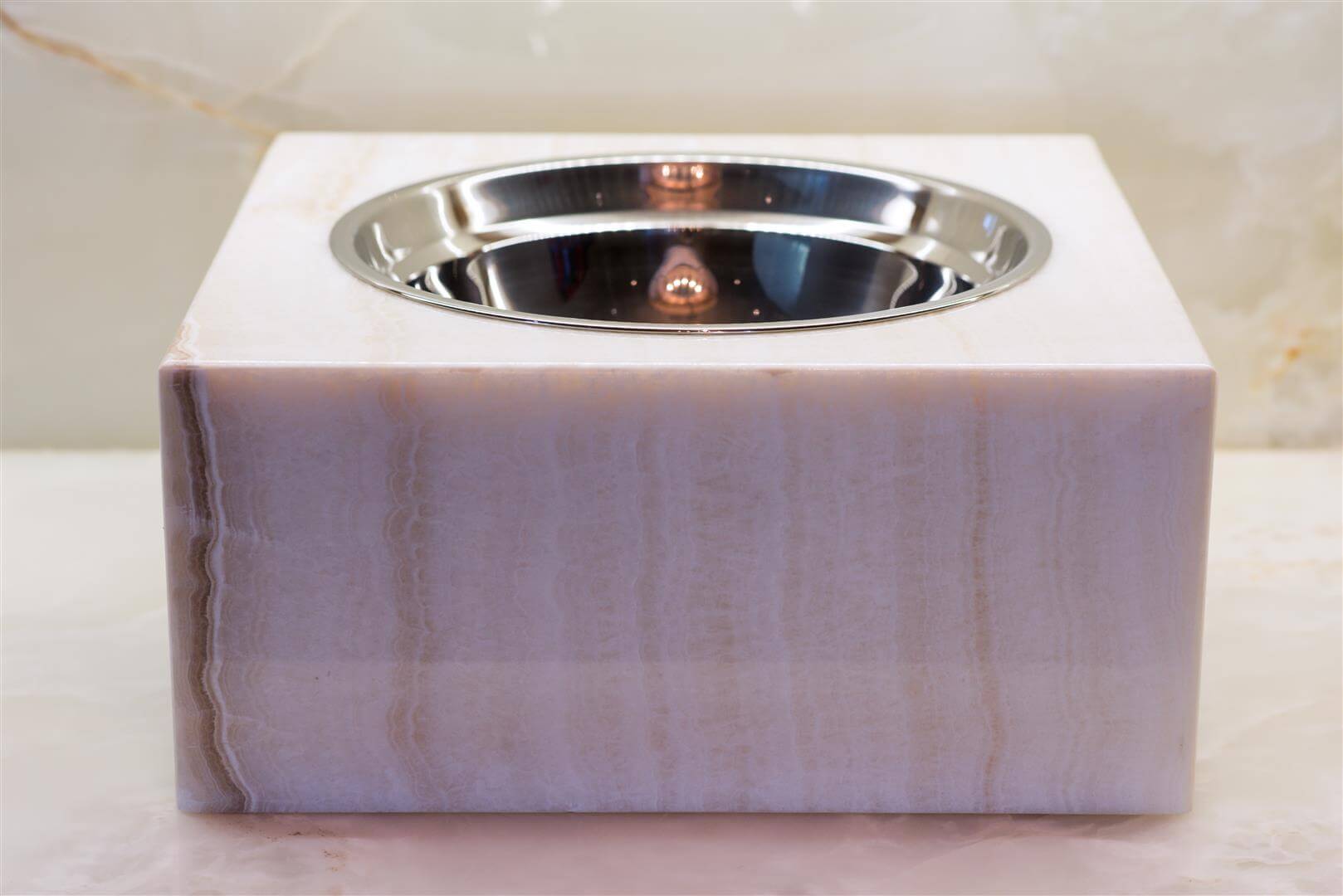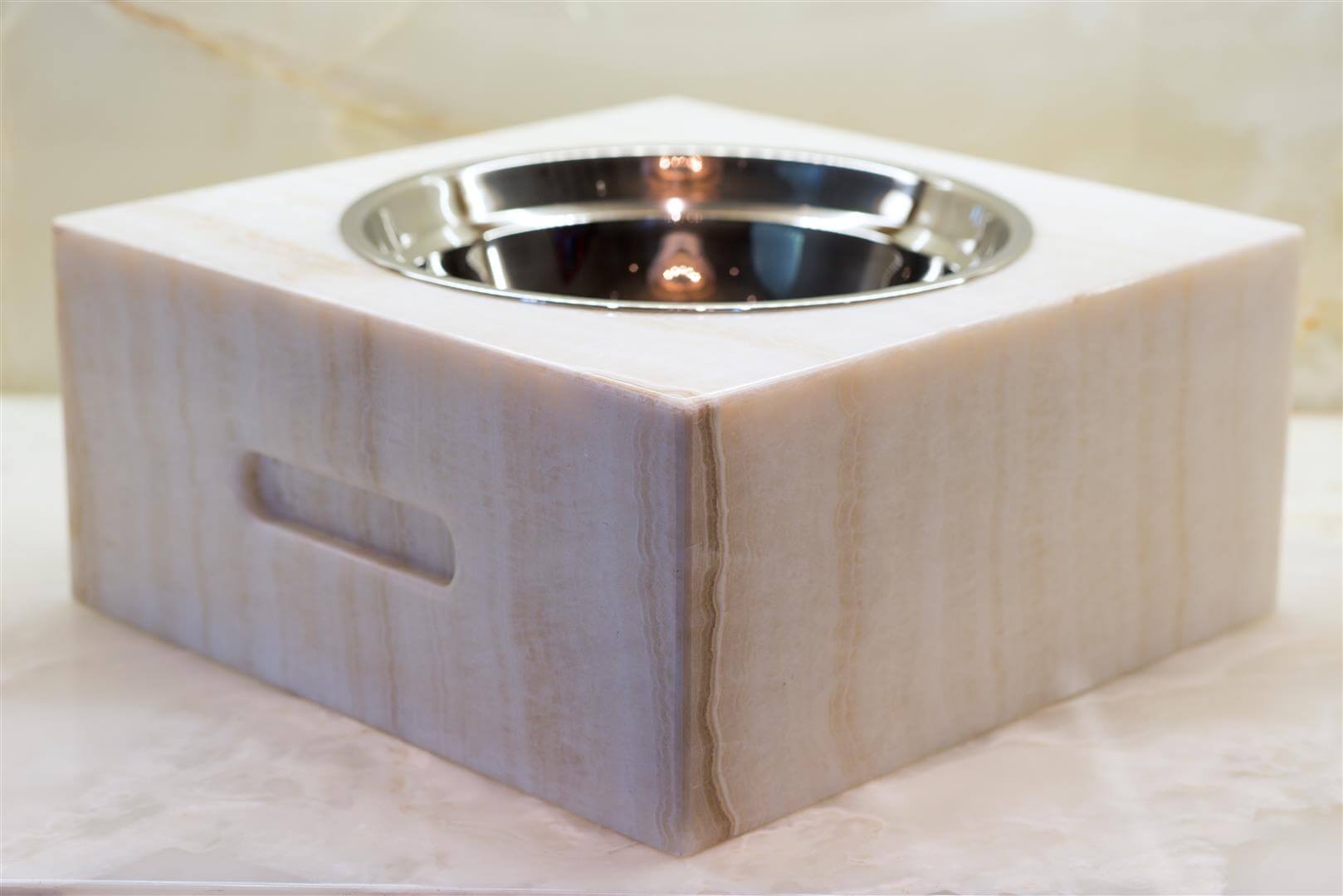 Fabricated from solid slab onyx + marble these beauties will get your pet in style while they dine on their Epicurean delights. Stainless steel bowl is machine washable to allow for effortless clean up.